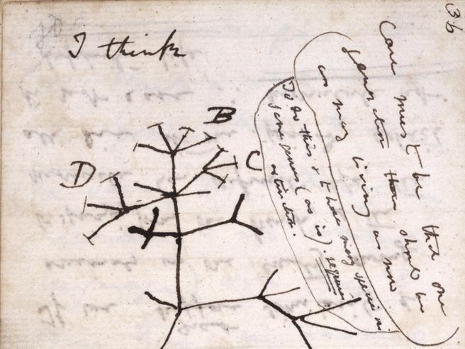 Fig. 2 -Charles Darwin (1850 c.a.), Notebook B pp. 36-37. Darwin creò questo disegno nel suo Taccuino B nel luglio 1837, poco dopo il ritorno dal viaggio sul Beagle, durante le sue prime riflessioni sulla ‘trasmutazione delle specie’ (evoluzione). Il disegno rappresenta una forma ramificata con un punto di origine (numero ‘1’) da cui si dipanano diversi rami, alcuni terminano con una barra perpendicolare (specie attuali), altri no (specie estinte).